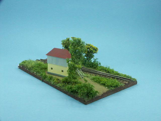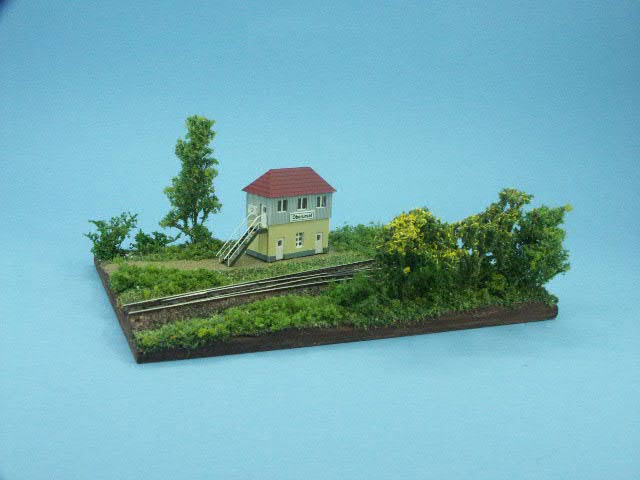 Jetzt kam das Grünzeug. Vorher wurde noch der Weg zum Stellwerk mit feinem braunen Sand gestaltet. Dann kam mein schon bekanntest grünes Gemisch auf die Gipsfläche. Auf diese Grundierung wurden dann alle anderen Gräser und Sträucher aufgeklebt. Den letzten Schliff erhielt das Diorama noch durch die größeren Bäume aus dem schon verwendeten Meerschaum.