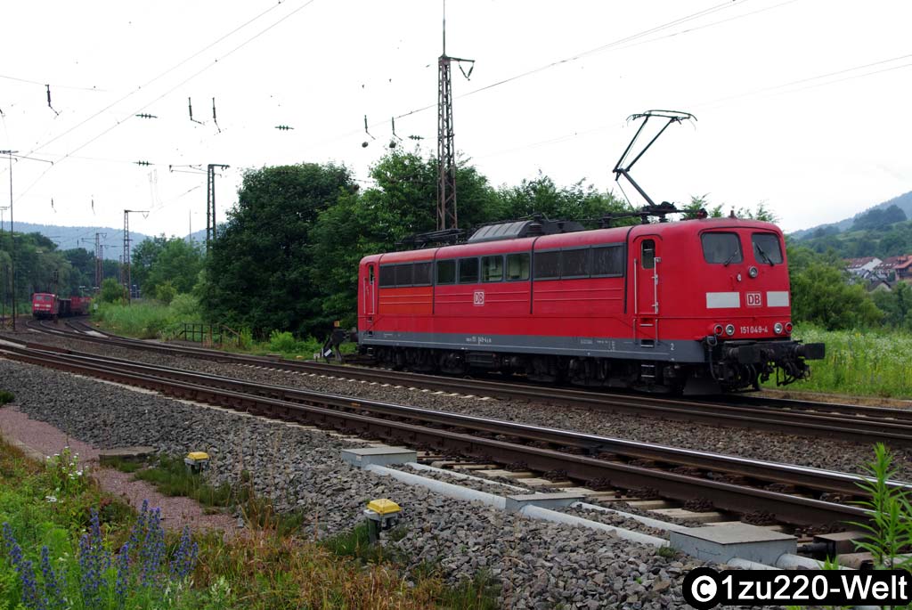 Kaum den Lokwartegleisen gegenüber angekommen, sahen wir, dass 151 086 sich hinter einen Güterzug im Bahnhof setzte, während 151 049 aufrüstete. Da rumpelte von Aschaffenburg ein weiterer schwerer Güterzug in das Nachbargleis des gerade anfahrenden ersten Zuges. Sogleich setzte sich 151 049 dahinter. Wir fuhren weiter zum Bahnhof, und da der zweite Zug noch eine Zugdurchfahrt abwarten musste, konnten wir dessen Ausfahrt in Ruhe fotografieren und filmen.