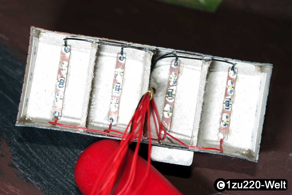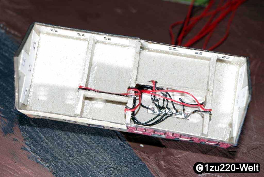 Nicht im Baubericht erwähnt wurde die Einteilung der Räume des Hauses. Diese ist mit Stückchen aus einfacher Graupappe erfolgt, um einzelne Räume gesondert beleuchten zu können. Um die verwendeten SMD-LEDs besser handhaben zu können, habe ich für die oberen Räume jeweils eine weiße 0608-LED mit einem SMD Widerstand auf ein kleines Stück Platine gelötet und mit zwei Kabeln versehen. Die Masse wird dann bereits im Haus auf einer Platine zusammengefasst und als ein Kabel herausgeführt.