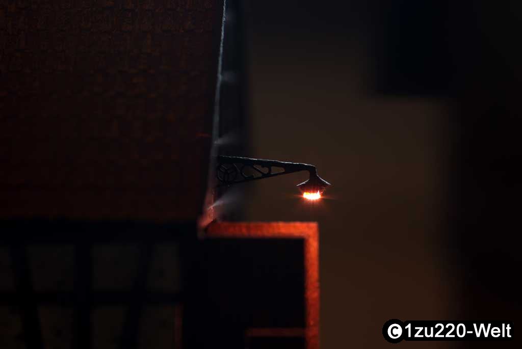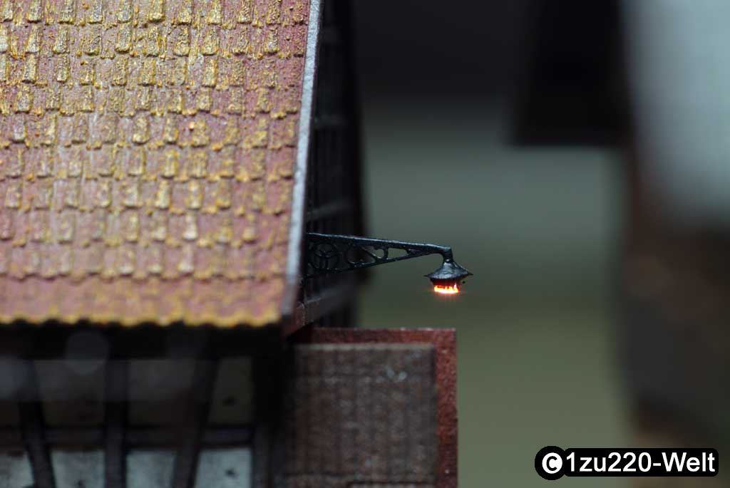 Ein kleines aber feines Detail ist eine Wandlampe über dem Tor des Schuppens. Die Beleuchtung ist mit einer weißen abgetönten 0603-LED, mit 0,1mm Kupferlackdraht verkabelt. Das Gestell ist aus 0,1mm Neusilber geätzt und die LED mit den verdrillten Kabeln am oberen Balken festgeklebt. Der Lampenschirm ist aus dünnem Packpapier, rund geschnitten und mit Sekundenkleber aufgeklebt.