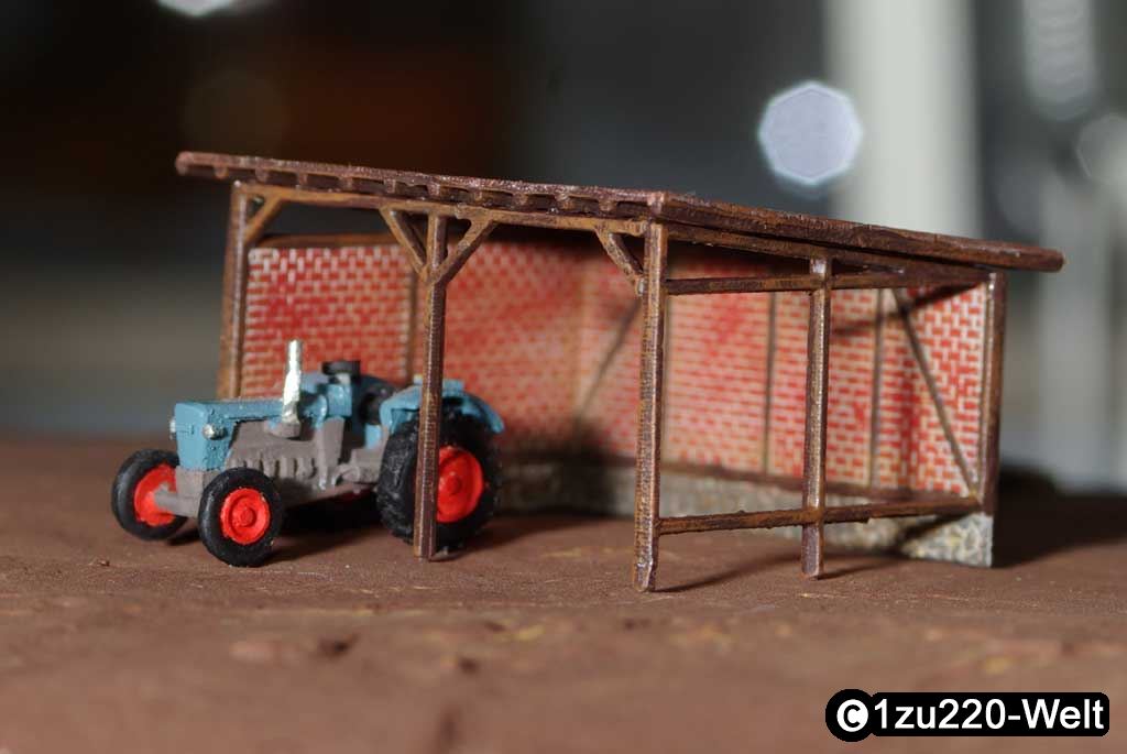 Um den leeren Platz links des Haupthauses zu füllen, habe ich schon eine geraume Zeit einen kleinen offenen Schuppen für die Landmaschinen gesucht. Leider bin ich bei keinem Hersteller fündig geworden. Also musste ich mir dafür wieder selbst etwas bauen. Da ich aber auch kein wirklich passendes Vorbild finden konnte, musste der Schuppen ein reiner Phantasiebau werden, der aber stilistisch zum Rest passen musste.