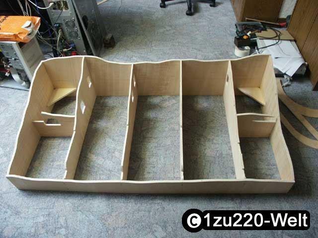 Ich habe mehrere Hefte gelesen, in denen immer wieder die Spantenbauweise als einfach und stabil dargestellt wurde. Ich vertraute auf die Fachkenntnis der Autoren und baute die Anlage auch in dieser Bauweise. Wintrack 6.0 kann die Spanten mit allen wichtigen Maßen ausdrucken, und so gab es keine Probleme mit dem passgenauen Ausschneiden der Trassenauflagen. Allerdings habe ich dort einen Fehler gemacht und die Dicke der Trassenbretter nicht mitberechnen. dadurch musste ich dann alle Auflagen um 5 mm tiefer ausfeilen, was kein Problem, aber anstrengend war.