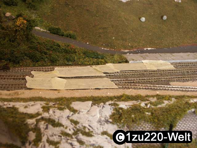 Bevor es jedoch an das Auftragen des Streumaterial geht, sollten die Weichen und Funktionsgleise der Anlage abgedeckt werden. Ich habe hierzu die Antriebe und Zungen mit Krep-Klebeband überklebt. Der kleinste Krümel kann die Funktion behindern, das soll hiermit verhindert werden.