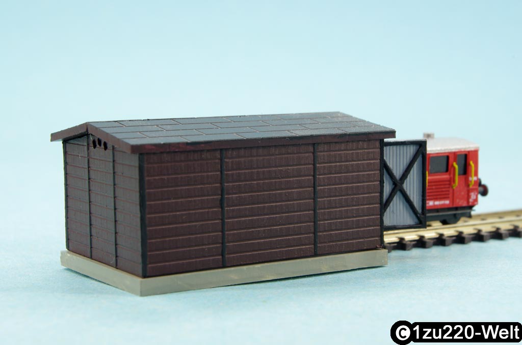 Ich habe hier jetzt passend zur Köf II (Railex) und verschiedene kleinere Verschiebefahrzeuge (z.B.Heckl) einen passenden Schuppen konstruiert. Für die Köf I und III passt er nicht. Hierfür ist eine größere Version geplant. Ich benötige jedoch erst Modelle dieser Loks, um genau Maß zu nehmen.