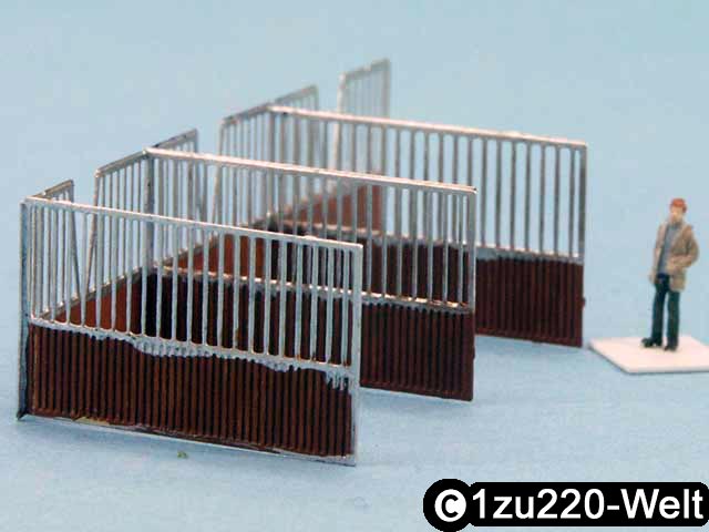Hier sind dann auch wieder die geätzten Boxen mit eingeflossen. So hat man im Inneren eine Unterteilung in 3 Kabinen mit einem Gang rundherum. Jede Kabine hat ein eigenes Fenster und eine geteilte Tür, so dass die Pferde zum Luftschnappen auch mal den Kopf rausstrecken können. Durch das Flachdach kann man das Gebäude sehr gut mit dem anderen Stall kombinieren, ohne dass es durch die gleiche Form langweilig aussieht.