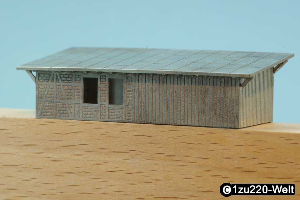 Anders als im Magazin habe ich das Modell jedoch nicht in Kunststoffbauweise und Handarbeit umgesetzt, sondern einen Ätzbausatz daraus gemacht. So können alle Strukturen fein und sauber nachgebildet werden. Bautechnisch stellte der Eingangsbereich zur Wartehalle die größte Herausforderung dar. Dort liegt das Fachwerk außen offen und musste in entsprechender Dicke ausgebildet werden. Dazu habe ich dort drei Schichten Blech verwendet. Die äußere Lage ist in die Grundwand integriert und zeigt nur die Balken des Fachwerks, die nächste Schicht beinhaltet zusätzlich die Fensterkreuze und mit Knicklinie versehen die Zwischenwand. Die dritte Schicht verschließt das Fachwerk von innen mit einer Bretterstruktur. Etwas aufwändig, aber nur so erhält man eine schöne Tiefenwirkung.