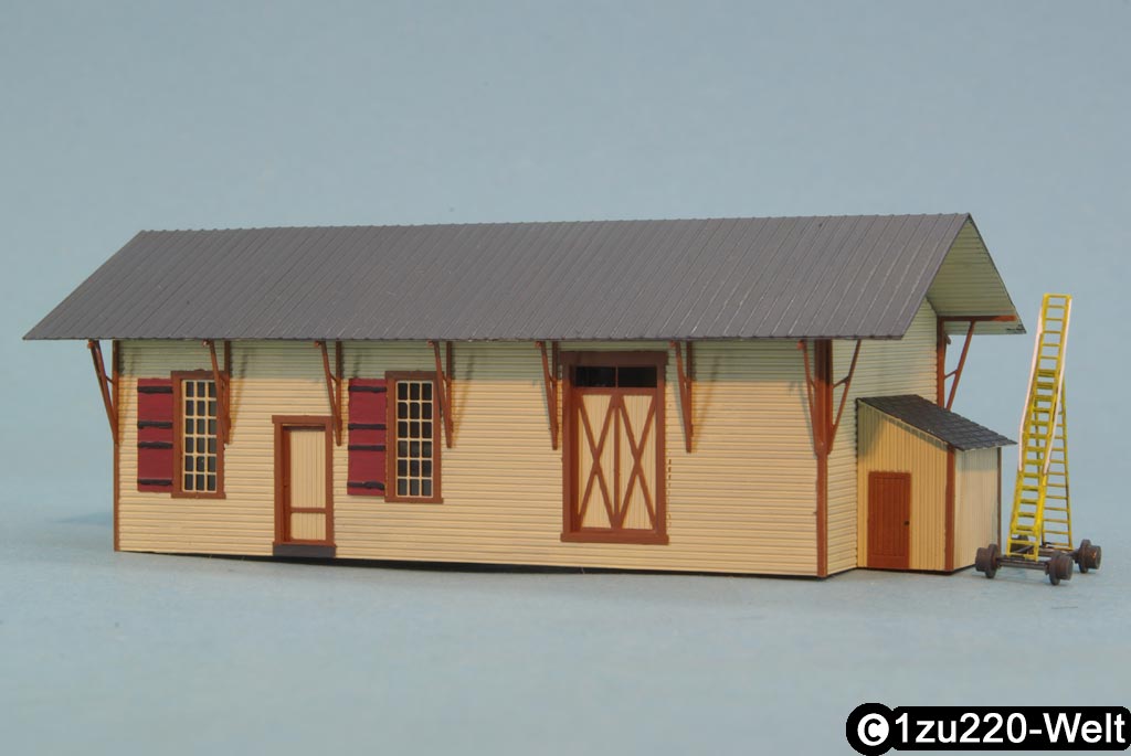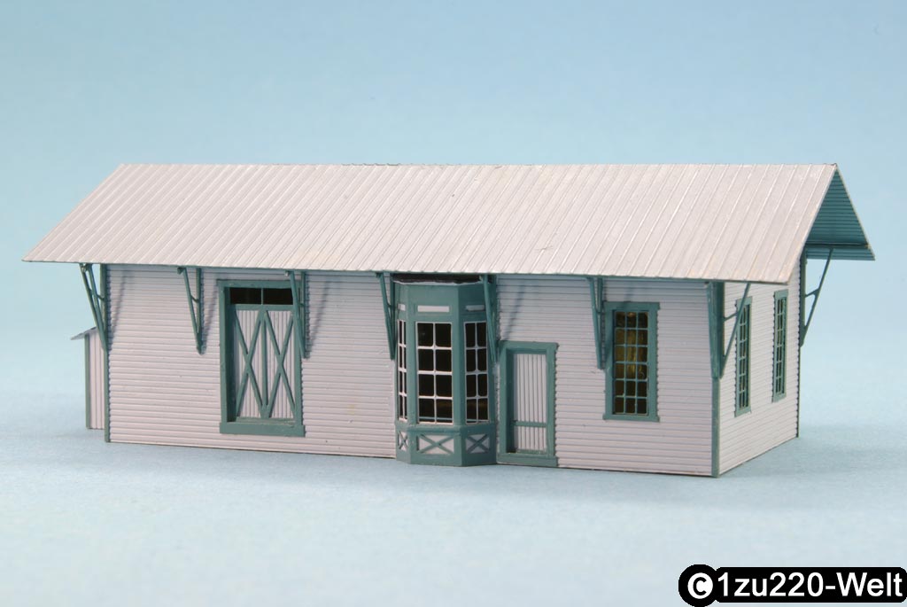 Passend zum Stellwerk gibt es nun auch ein Bahnhofsmodell nach amerikanischem Vorbild. Die Vorlage bildeten eine Zeichnung und Fotos in einem US-Modellbahnmagazin. Der Bahnhof liegt im Madison County im Staat New York und ist ein wunderschönes Holzgebäude mit weiten Dachüberständen. Im Inneren ist er aufgeteilt in einen Wartebereich für Fahrgäste und einem Abteil für Waren und Gepäck.