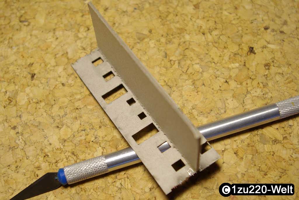 Im nächsten Bauabschnitt werden die Fenster eingeklebt. Obwohl das Papier schon weiß ist, habe ich die Fenster noch einmal lackiert um Schmauchspuren vom Lasern zu überdecken. Da ich als Stabilisierung die zusätzliche Decke eingezogen habe, konnte ich natürlich die durchgehenden Fensterflächen nicht direkt einkleben. Um das Kleben zu erleichtern, habe ich diese in passende Häppchen von 3-4 Fenster zerschnitten.