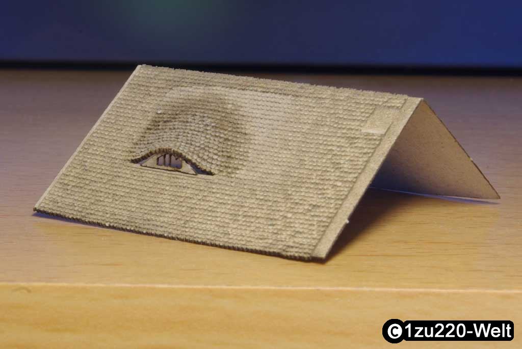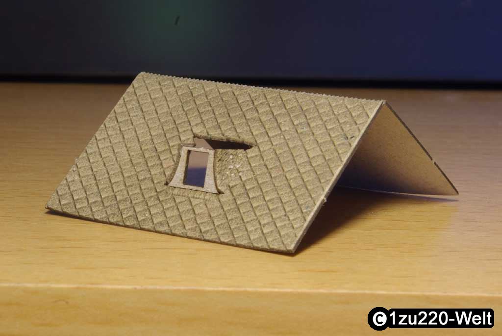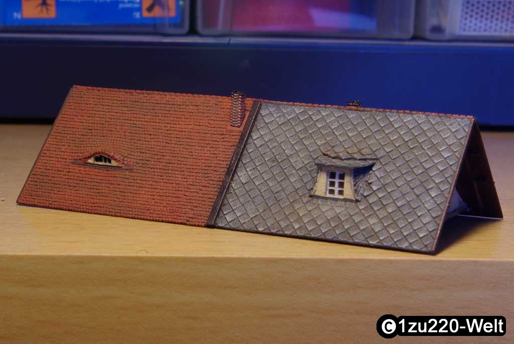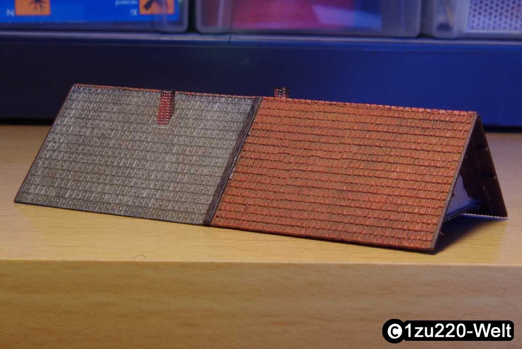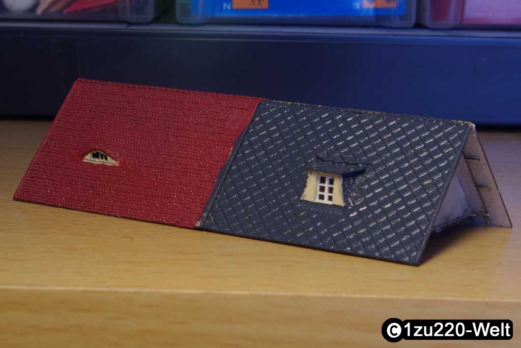 Jetzt musste das Dach noch seine Farbe erhalten. Ich habe mich bei der einen Hälfte für dunkelgrauen Schiefer entschieden und die andere mit Tonziegeln eingedeckt. Dabei erfolgte der Farbauftrag in folgender Reihenfolge: