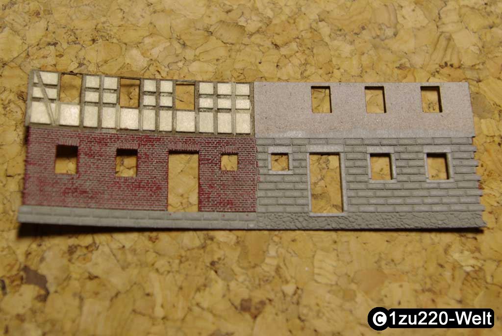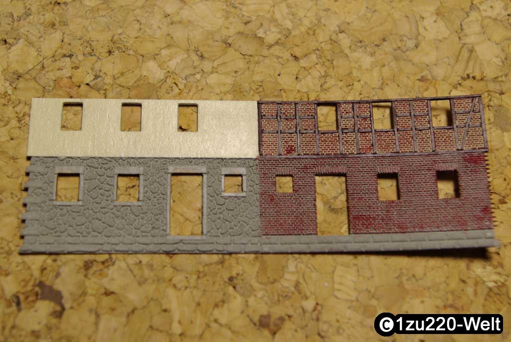 Vor dem Zusammenbau habe ich bereits die farbliche Behandlung der Teile vorgenommen. Im ersten Schritt habe ich die verputzten Flächen und die Ziegeln im oberen Teil in elfenbein grundiert. Die untere Wandhälfte ist komplett in grau gestrichen. Als Farben habe ich deckende lösungsmittelhaltige Farben von Elita verwendet.