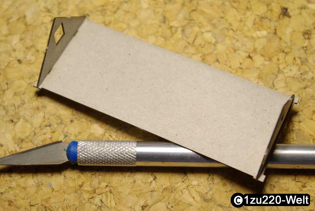 Kommen wir nun zum eigentlichen Zusammenkleben der Wände. Hier bin ich jedoch wieder auf ein Problem gestoßen. Dem Bausatz liegt neben der obersten Decke noch ein Boden bei, der auch aus ca. 0,5mm Pappe besteht. Um die verzogenen Wände gerade zu ziehen, ist dieser jedoch zu dünn. Also habe ich mir aus einer 1,5mm Graupappe einen weiteren Zwischenboden gefertigt. Der Boden hat den Vorteil, dass man einfacher einzelne Räume pro Stockwerk beleuchten kann. Eingeklebt wird der Boden knapp über den Fenstern des Erdgeschoss. Auch hier ist wieder ein kleiner Winkel hilfreich.