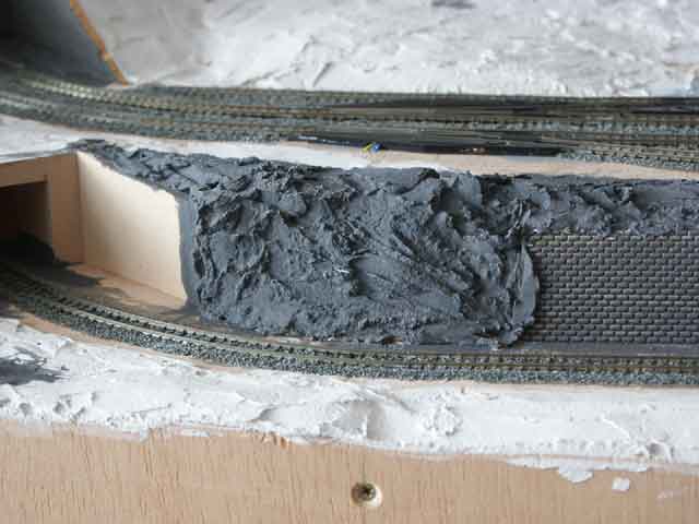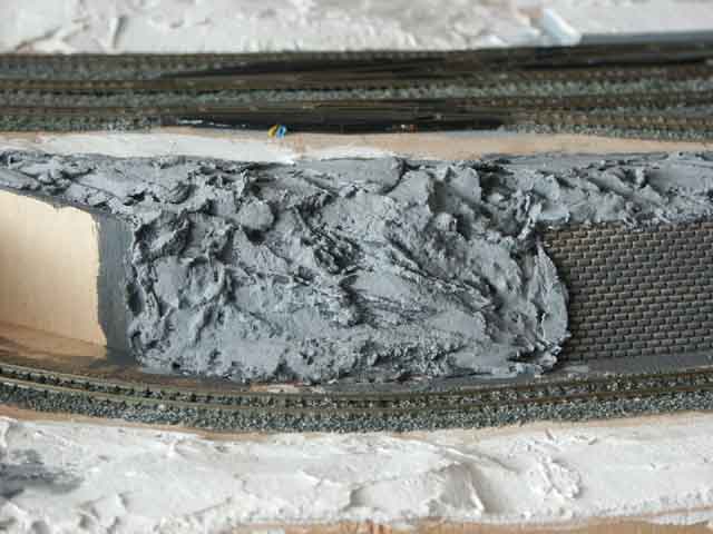 Die Masse wird nun in einer Dicke von 1-1,5cm aufgetragen. Hierbei muss nicht sorgfältig gearbeitet werden, da Felsen ja auch von Natur aus unregelmäßig sind. Durch streichen und tupfen mit einem kleinen Spachtel (am besten eigenen sich dafür Formspachtel von Conrad), werden die Felsen herausgearbeitet. Hierbei sollten auch einige ebenen Stellen entstehen, um dort kleine Bäume und Sträucher zu platzieren. Durch aufklatschen der Spachtel und das Abziehen danach können Felsnasen gebildet werden. Beschreiben lässt sich das schwer, man muss es selbst einfach auf einer kleinen Fläche ausprobieren.