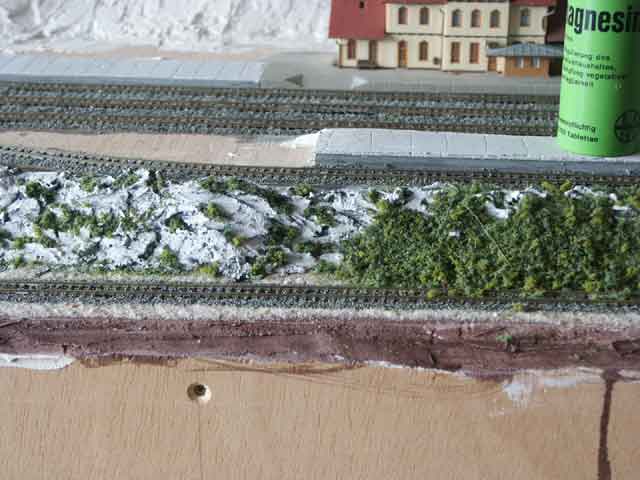 Jetzt sind alle beleimten Stellen begrünt. Falls es die Gegend erlaubt, können noch Bäumchen und Büsche aufgeklebt werden. In meinem Fall geht es nicht, da diese sonst in den Lichtraum ragen könnten.
