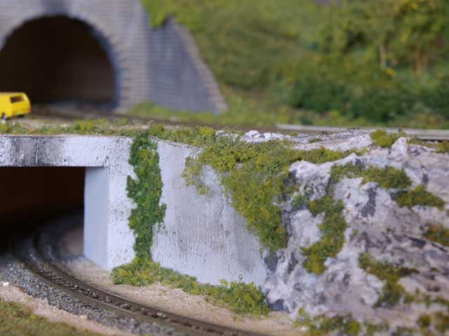 So oder so ähnlich könnte das Ergebnis jetzt aussehen. Hier habe ich außerdem noch etwas Foliage von Woodland angeklebt, um Efeu nachzubilden. In der Ecke des Tunnelportals wurd ein Streuzeug-Leim-Gemisch geschmiert. Auch dies soll eine Kletterpflanze darstellen.